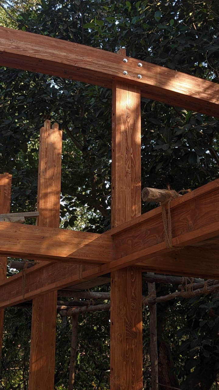 The project explores the potential of pine wood as a structural timber through innovative techniques such as glu-lamination, finger joining and nail-less construction. The natural wood complements with Indian patent Stone, a cast in place handmade material, to craft an inviting, warm environment that merges with the fabric of the village.